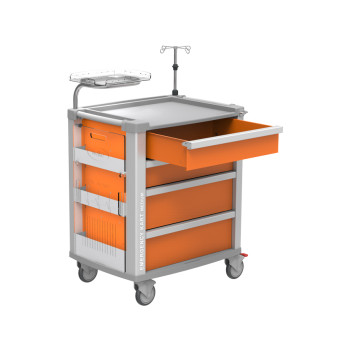 EMERGENCY MEDIUM KART - 5 drawers - red Size: 804 x 616 x h 975 mm High quality aluminium emergency cart with superior features. - work-top in high performance copolymer, with perimetric edge for liquid containment - extruded aluminium frame, with superficial silver antioxidant treatment offering more lightness, resistance and reliability - ergonomic stainless steel handles, fitted on both sides for easy handling - drawer structure built in steel sheets, epoxy powder coated - full pull-out sliding drawers - interchangeable drawer position - aluminium drawer handle with “hook/unhook” system to prevent accidental opening of drawers - high drawers capacity - centralized locking system with single use seals - 6 integrated side pockets (3+3) to hold bottles or small items - swivelling wheels Ø 125 mm (two with brake) in thermoplastic rubber with threadguards, hub on precision ball bearingsExtra informatie