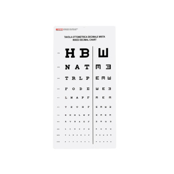 MIXED DECIMAL chart (Not suitable for Portugal) • Working distance: 10 feet - 3 m • Size: 28 x 56 cm Polypropylene natural white sheet, approx. thickness 0.8 to 1.0 mm Multilingual instruction: GB, FR, IT, ESExtra informatie