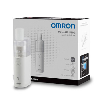 OMRON MICROAIR U100 MESH NEBULIZER - NE-U100-E MicroAIR U100 is a small, portable mesh nebulizer that helps to efficiently treat many respiratory conditions of the lower airways, from a simple cough to asthma. - portable, pocket-sized and battery operated, it can be used anywhere, anytime. - soundless operation enables discreet use. - 360° operation: the unique design allows to use it in any position, even when lying down in bed, making it more comfortable for children. - simple one-button operation. - unique mesh technology makes it more efficient and more comfortable to use than traditional nebulisers. Supplied with unit cover, medication container, mesh cap, mask adapter, mouthpiece, adult mask, child mash, soft pouch, 2xAA batteries, quick guide and multilingual manual GB, FR, IT, ES, DE, NL, TR, RU, Arabic. Technical Specifications Operating mode: continuous use Nebulizing rate: > 0.25 ml/min Capacity: 1-10 ml Particle size: 4.5 µm Noise level: 20 dB Power supply: 2xAA batteries, 3 VDC Battery life: 4 hours Power consumption: approx 1.2 W Size-weight: 38x60x130 mm - 120 g Safety: type BF (applied part), IP55Extra informatie