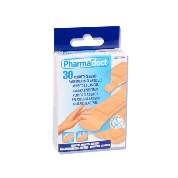 PHARMADOCT: first aid, medication and wellness. • Assorted plasters, 5 sizes: 10 (7x2), 10 (4x1), 2 (3.8x3.8), 4 (7x2.4), 4 (Ø 2.5) • Pieces per box: 30 • Minimum order: 12 box Graphic of Pharmadoct line boxes are subject to changes. All products are in blister with 7 languages package (GB, FR, IT, ES, DE, PT, GR).Extra informatie